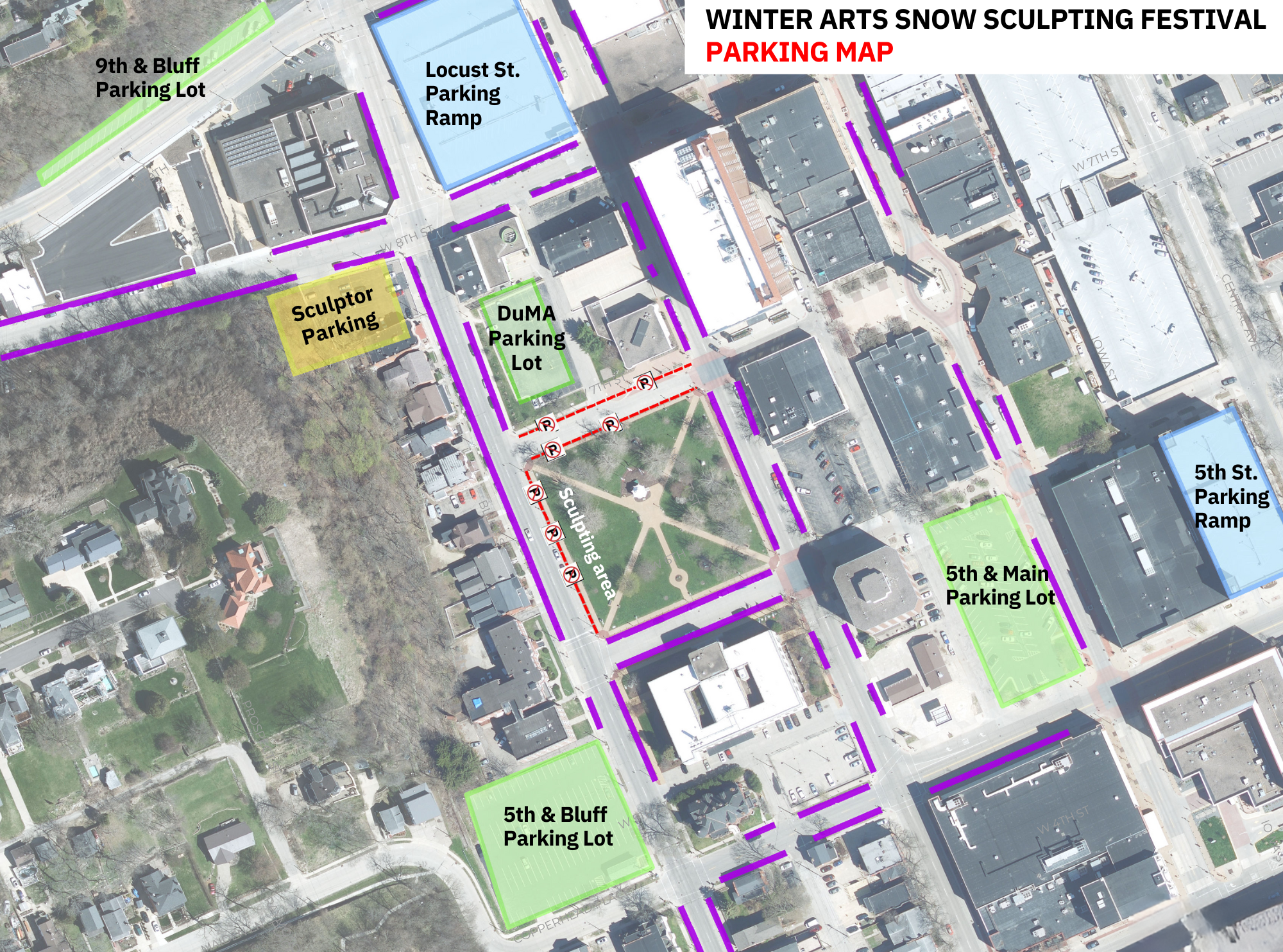 Teams will be located along Bluff St., sculpting from Thursday, Feb. 6, until 12 p.m. on Sunday, Feb. 9. Each team begins with 6 ft. by 8 ft. block of manufactured snow. The public is encouraged to visit sculptors and observe the carving process throughout the week and into the weekend.