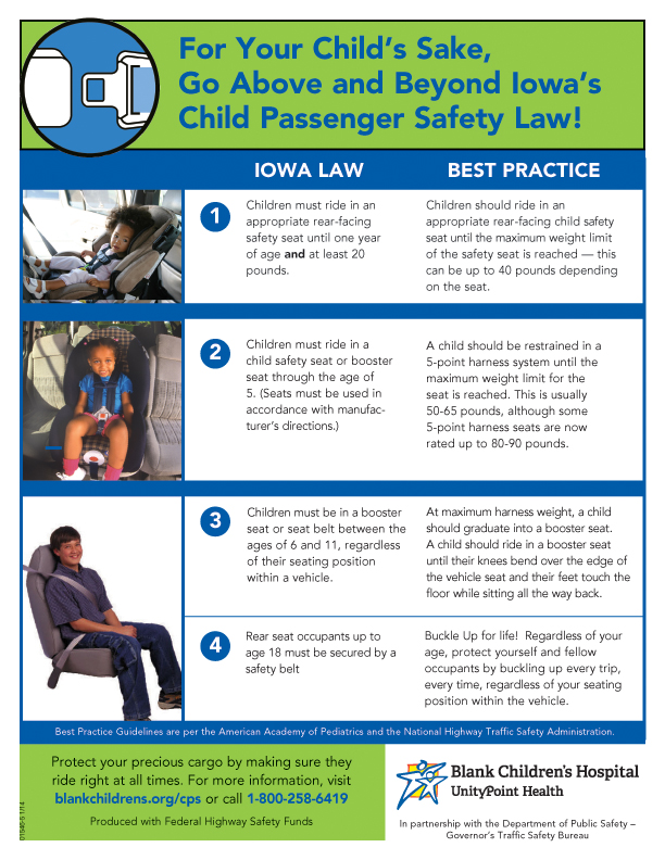Iowa Code defines what type of restraint a child must be in, though child safety experts consider the legal requirements to be a minimum standard. Please view the Law vs. Best Practice flyer for recommended restraint options.