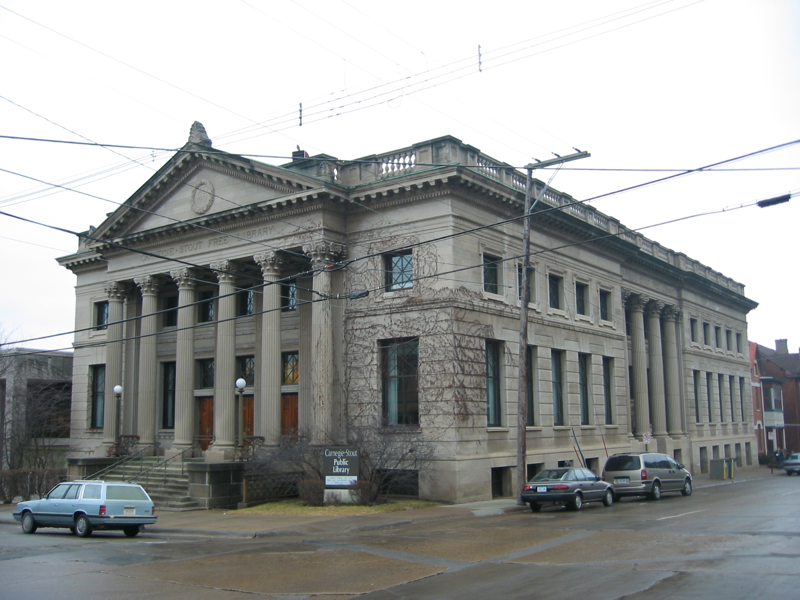 Andrew Carnegie donated $60,000, the Stout Family the land, valued at $20,000 and the Young Men’s Library Association $15,000 and the library's start-up collection (their library). The north and west sides are built of Indiana Bedford limestone. The Roman Corinthian portico is modeled after that of the Pantheon in Rome and supported by fluted columns.